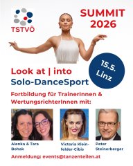 In Zusammenarbeit mit und auf Bitte des ÖTSV wird das Thema zum Solo-TanzSport im Rahmen des TSTVÖ-Summits zum ersten Mal in Österreich aus Wertungsrichter:innen- und Trainer:innensicht beleuchtet werden.