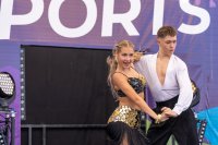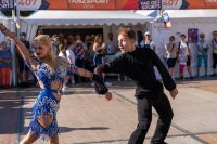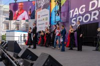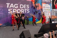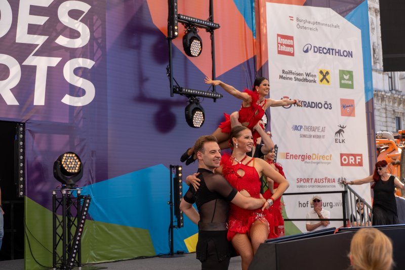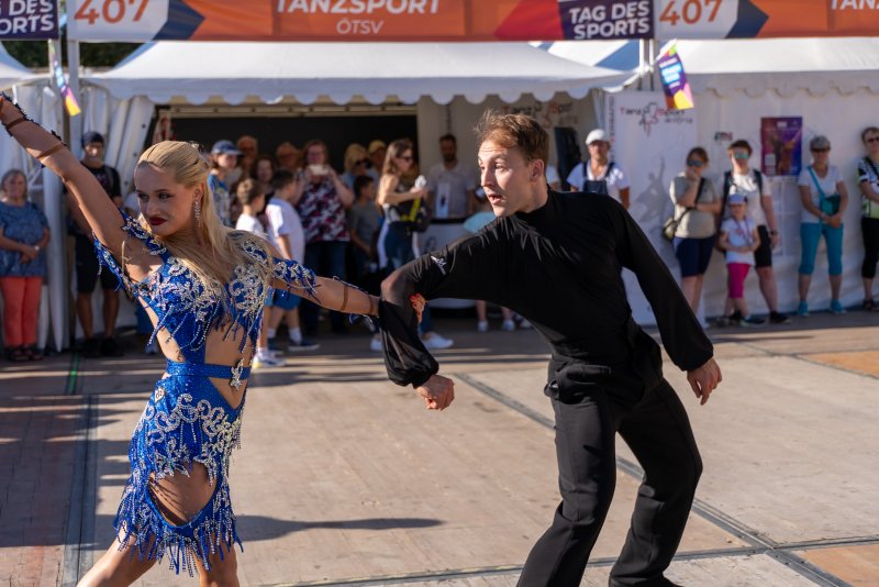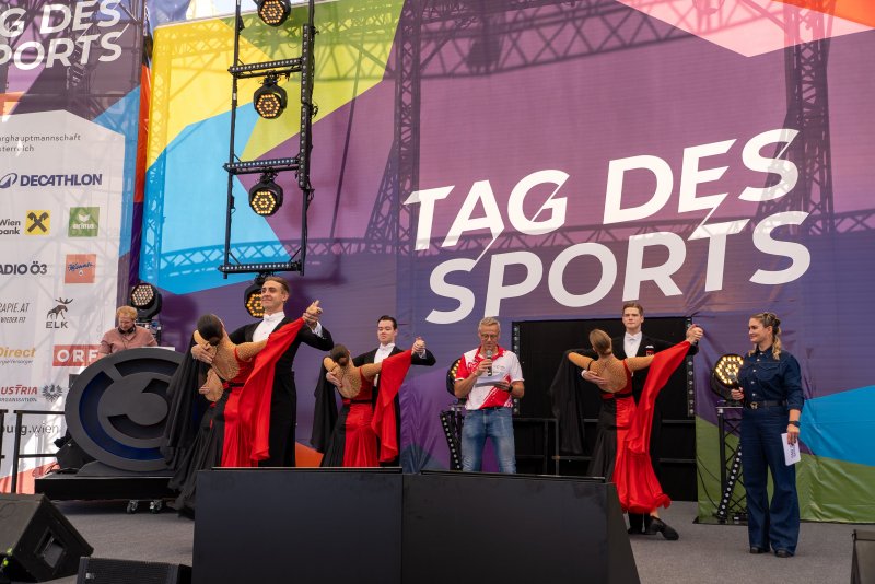 Der ÖTSV wurde dieses Mal auch auf die Hauptbühne des Tag des Sports eingeladen. Am späten Vormittag konnte sich das Standard-Team des TSC Schwarz-Gold Wien präsentieren. Am Nachmittag hatte der UFTSC Perchtoldsdorf die Gelegenheit, sein Können zu zeigen. Die Vorführungen verlangten den Teams auch hier alles ab: eine auch für nur 4 Paare viel zu kleine Tanzfläche und der Teppichboden mussten bewältigt werden. Mit höchster Professionalität und unter großem Applaus der Zuschauer:innen gelangen diese Auftritte ebenso perfekt, wie jener von Tobias Ottner&Melaniia Petrova, die ebenfalls auf der Hauptbühne bejubelt werden konnten.