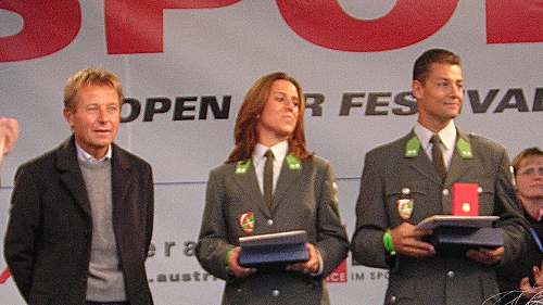 an das Weltcupsiegerpaar Manuela Stöckl und Florian Gscheider durch den Herrn Staatssekretär Mag. Karl Schweitzer